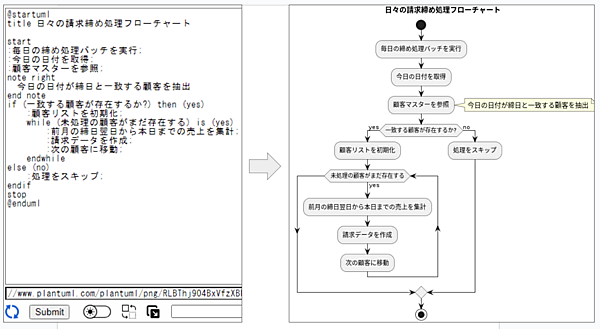 AIを使ってフローチャートを自動作成するツールもたくさん出まわっています。ここではテキストベースの記述からUML図を生成するオープンソースのツールPlantUMLを使ってフローチャートを生成してみましょう。