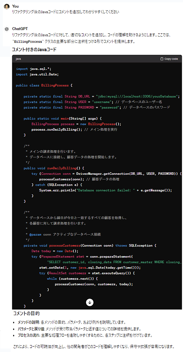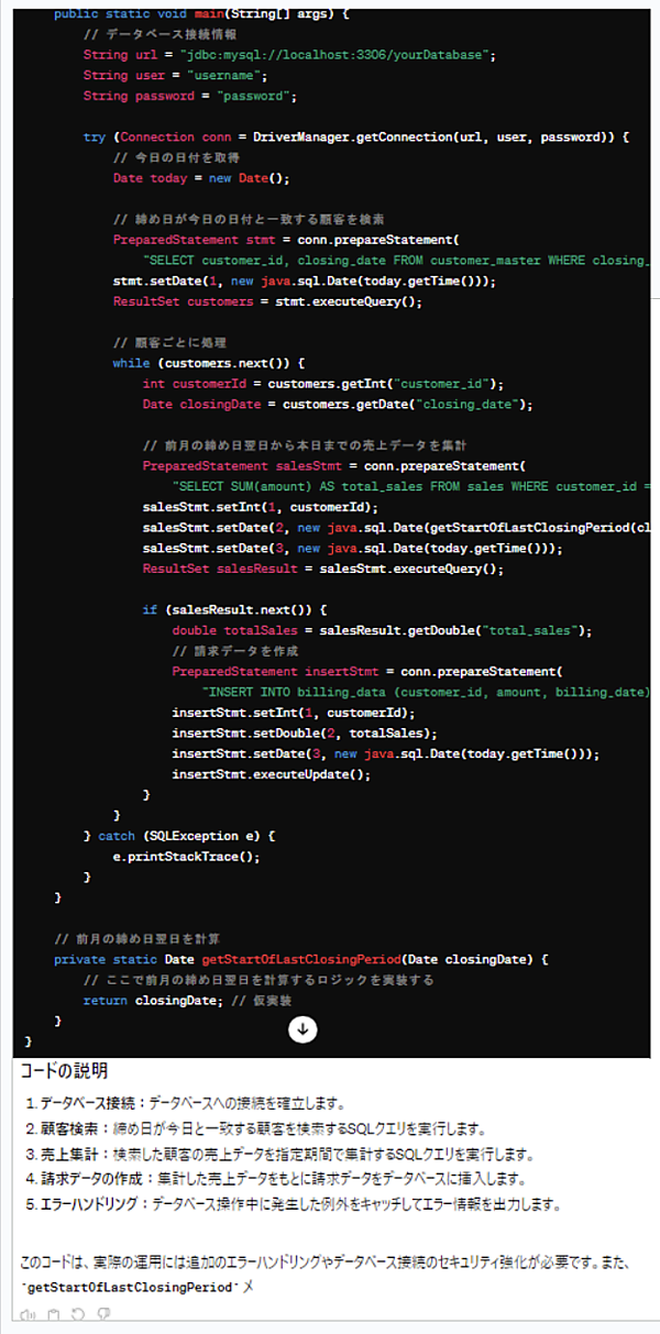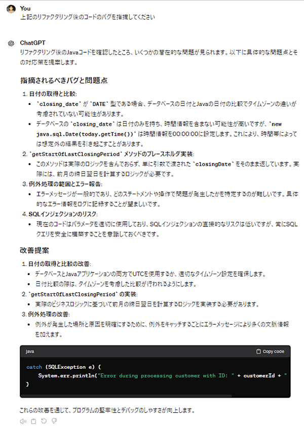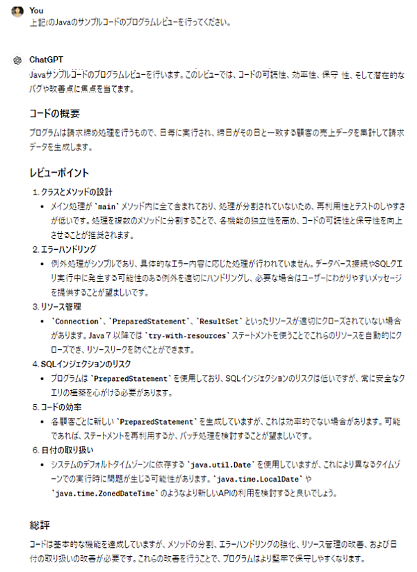 図5のサンプルコードに対してプログラムレビューをしてもらった結果が図6です。レビューポイントとして、クラスとメソッドの設計、エラーハンドリング、リソース管理、SQLインジェクションのリスク、コードの効率、日付の取り扱いなどを挙げてくれていますね。このように指摘してくれると自分でもチェックするポイントが明確になって、コード品質を向上させることができます。
