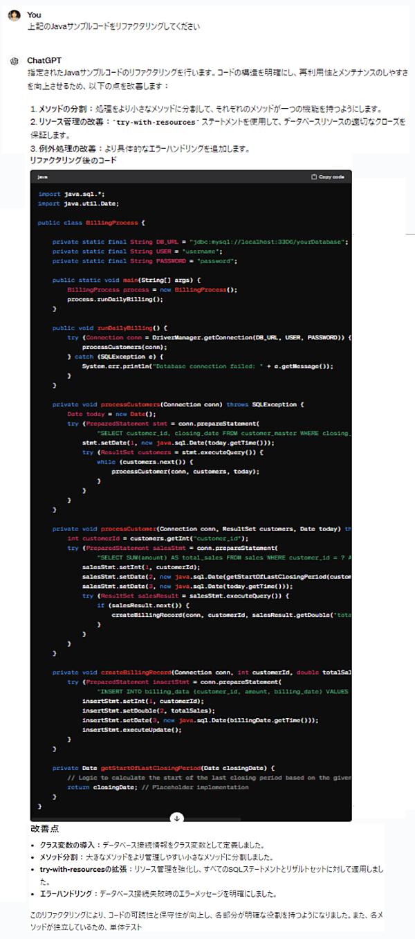 ChatGPT4に「上記のJavaサンプルコードをリファクタリングしてください」と伝えると図7のようにリファクタリングを行ってくれます。生成AIが自分で作成したばかりのコードにもリファクタリングさせると、だいぶ洗練されたものになることが分かりますね。部下が提出した文章を「まず、自分で推敲して」と伝えるだけでだいぶマシになるような感じですね(嫌な上司ですが)。
