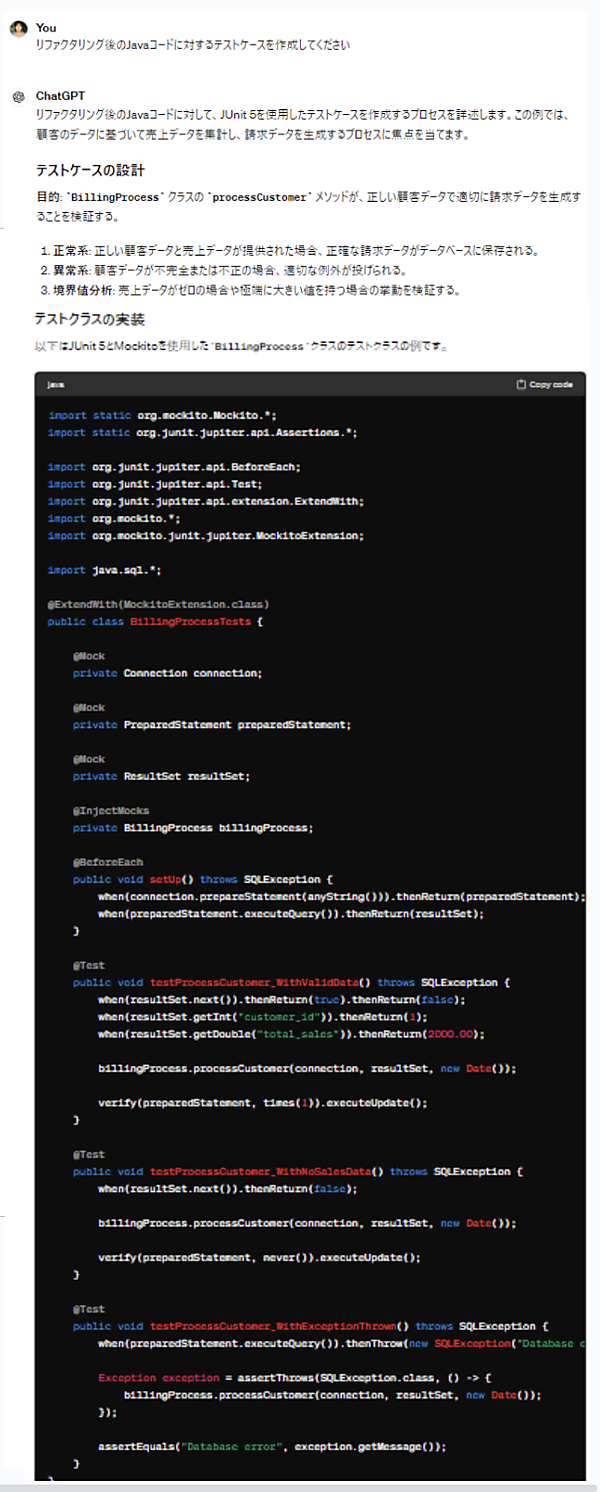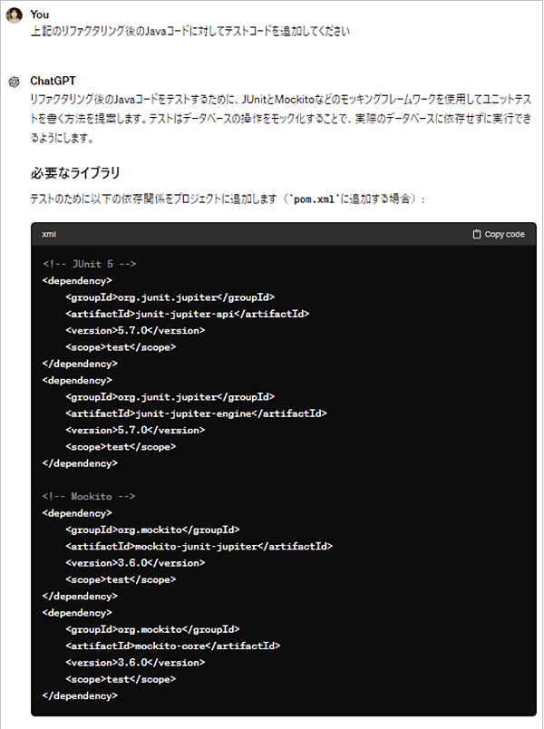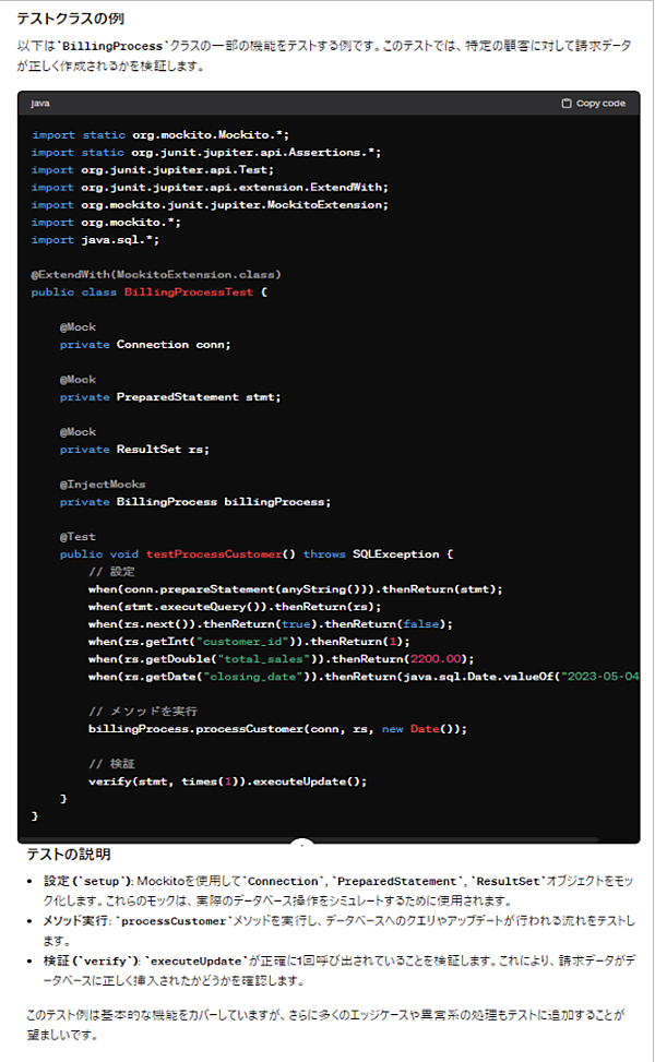 最近のプログラミングでは、テストコードを記述してテストを自動化することが主流になりつつあります。テストコードの作成にも生成AIを活用してみましょう。上記のJavaコードにテストコード作成を依頼すると、JUnitやMockitoなどのモッキングフレームワークを使用したユニットテストを書く方法を提案してくれます(図11)。