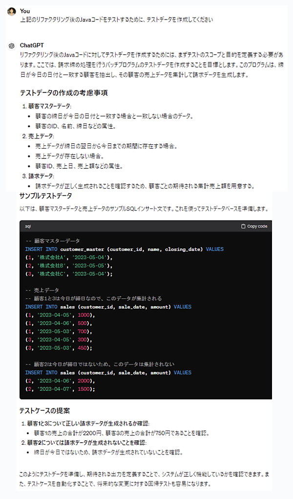 テストケースやテストコードだけでなく、テストデータも生成AIに作成してもらいましょう。「Javaコードをテストするためのテストデータを作成してください」と依頼すると、図12のようにテストデータ作成の考慮事項と、実際のサンプルテストデータを作るためのInsert文も提供してくれます。