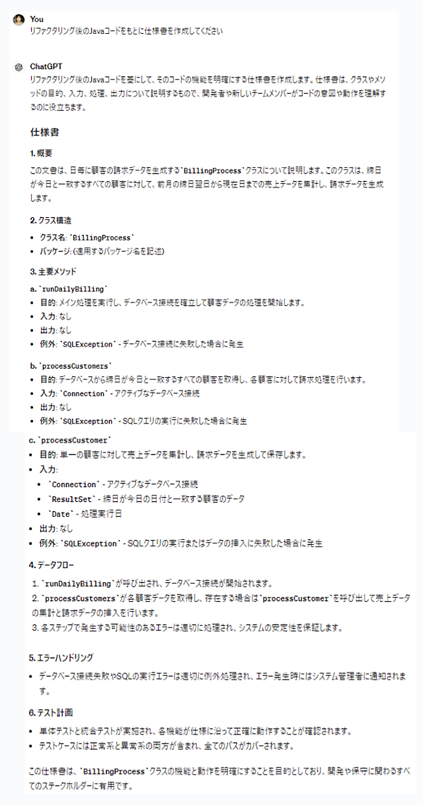 「Javaコードをもとに仕様書を作成してください」と依頼すると、図13のように体系的にドキュメントにまとめてくれます。この作業も何回かプロンプトをやり取りすることで完成度の高いドキュメントにブラシュアップすることが可能です。