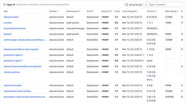 Robustaがインストールされているクラスタの情報を表示します。クラスタにデプロイされているアプリケーションなどがいくつあるか、その中で正常ではないものがいくつあるかなどを簡単に確認できます。また、クラスタのKubernetesのバージョンやrobustaのバージョンなども確認できます。