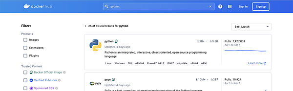 今回はDocker Hubを使います。Docker Hubにアクセスして検索バーにpythonと入力すると、Pythonの公式イメージが表示されます。ここでは、最新のPython 3.9を使うことにします。