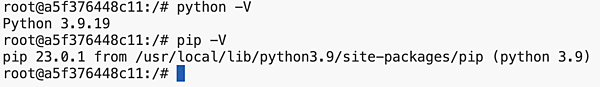 docker run -it --rm my-python-app bash-it(-i -tの省略形)オプションはコンテナを対話的に起動するためのものです。--rmオプションはコンテナを終了したら削除するためのものです。 - コンテナが起動したら、環境が起動します。Pythonの環境が起動していることを確認できます。