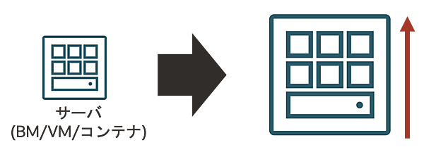 - アプリケーションやソフトウェアが稼働する環境のリソース(CPU, メモリ...)やスペックを向上させることによってシステムの処理能力を向上させる手法