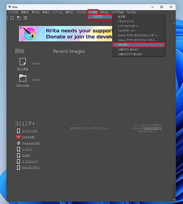 KritaでPythonをプログラミングするには「スクリプター」機能を使います。スクリプターは図3のように「ツール」→「スクリプト」→「スクリプター」メニューにあります。