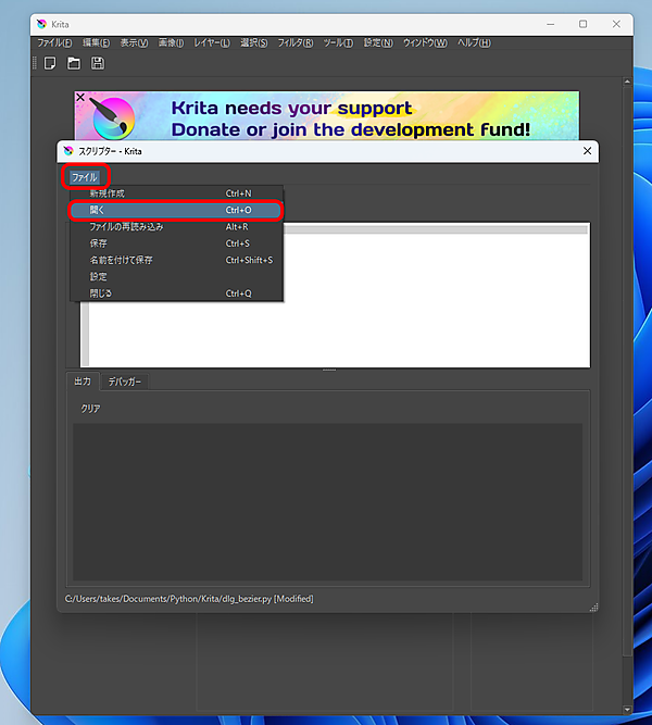 既存のpyファイルを開くには、図4のように「スクリプター」にある「ファイル」→「開く」メニューで開きます(Kritaメインの「ファイル」→「開く」メニューではありません)。ここではまだ何も開く必要はありません。
