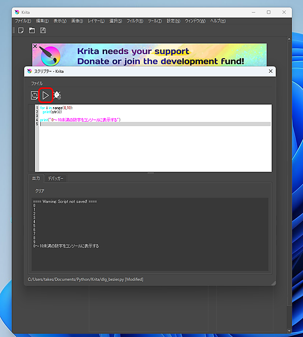 print("for文で何もしない")先ほどのサンプルスクリプト01のようにスクリプティングし、図5のように右向き三角「▷」をクリックして実行するとコンソール画面に文字が表示されます。ここでは、まだ図形を描くなどのKritaの機能は使っていません。