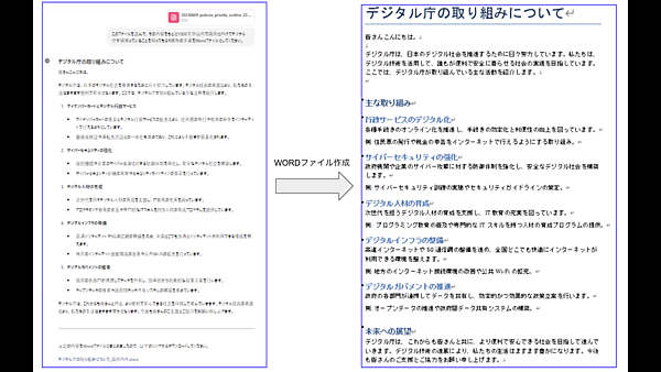 図2の右側が作成されたWordファイルです。ChatGPT-4oに表示された文章とほぼ同じ内容が、良い感じでWordにまとめられていることが確認できます。