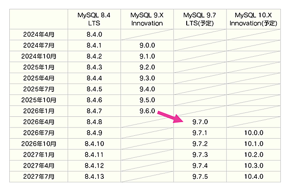 そして、約2年後にそれまでのInnovation Releaseの成果をまとめて LTS版がリリースされます。MySQL 9.X を例にすると、MySQL 9.1、9.2…9.6とリリースされたところで次がLTSリリースのタイミングになるので、MySQL 9.7 LTSとしてリリースされるということになります。LTSがリリースされると、新たなInnovation Release系列であるMySQL 10.0、10.1…とリリースされていきます。このように、LTS版とは、そこまでのInnovation Releaseの集大成のものだと言えそうです。