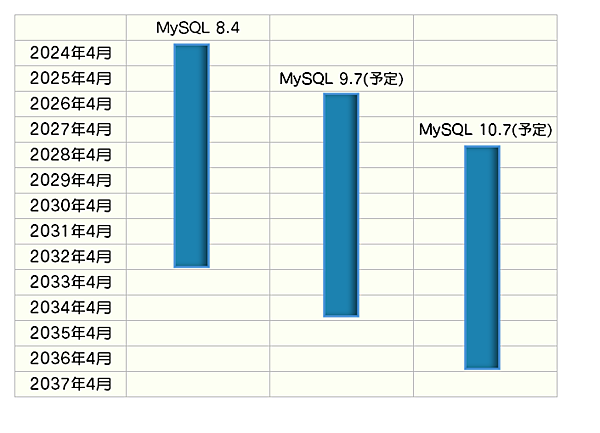 本記事では、MySQLの新しい開発モデルである、LTS(Long-Term Support)版とInnovation Releaseについて、具体的な公開タイミングを含めて紹介しました。MySQL 8.0のサポート期間は2026年4月までとデータベースのアップグレード準備期間としてはそう遠くないところまで迫ってきています。MySQL 8.4 LTSのサポート期間は8年間もありますので、MySQLを運用されている方はこの機会に MySQL 8.4 LTSへのアップグレードを検討してみてはいかがでしょうか。