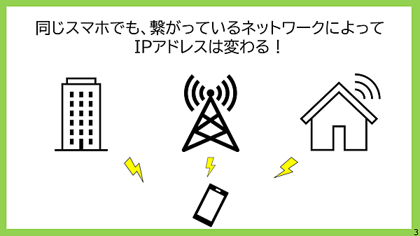 さて、このIPアドレスですが、これはスマホやパソコンなどの機械に紐づいているわけではありません。Wi-Fiに接続したり、通信環境が変わる度にIPアドレスは変化します。このように、動的に変化するIPアドレスによってパソコンやスマホはどんなネットワークからでも世界と通信することが可能になっているのです。