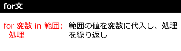 for文は図5のように範囲の間だけインクリメント(1ずつ追加)された値を変数に入れて処理を実行する繰り返し構文です。for文を繰り返すときの処理文は1インデント字下げします。