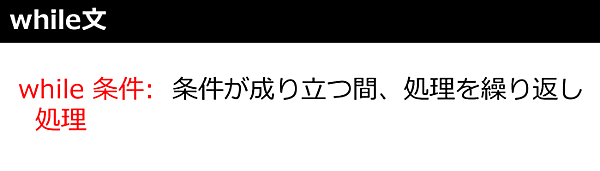 while文は図6のように条件が成り立つ間だけ処理を実行する繰り返し構文です。次のサンプルスクリプト「while.py」では「list」リストの後ろに“いちご"要素を追加(append)し、listリストの最後の要素を削除(pop)しています。while文を繰り返すときの処理文は1インデント字下げします。