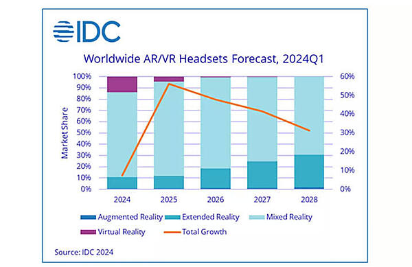 米調査会社のIDCは、2024年のVR/ARヘッドセットの出荷予想を発表しました。調査によれば、VRのみに特化したデバイスの市場シェアは減少し、Appleの「Vision Pro」やMetaの「Meta Quest 3」など、MRヘッドセットのシェアが伸びています。なおこの変化は分類法の改訂による「MR」「ER」の新設が影響しています。