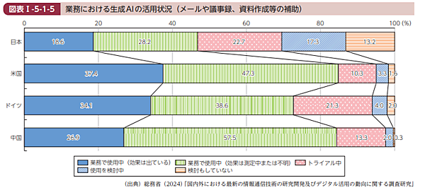 総務省が7月5日に発表した「令和6年版 情報通信白書」によると、日本における生成AIの利用率はわずか9.1%。一方、アメリカでは46.3%となっています。さらに日本では企業の46.8%が生成AIを社内業務に利用していますが、これは米国の84.7%やドイツの72.7%と比べるとかなり低い数字です。日本企業の多くは、会議の議事録作成やメール作成、資料作成といった内部的な業務から慎重にAIを導入し始めている段階です。一方、欧米企業ではすでに顧客対応など、より幅広い業務でAIが活用されています。