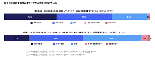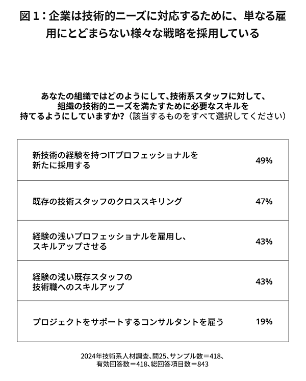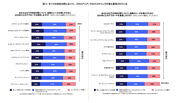 下図では、採用(49%)だけではなく、クロススキリング(47%)やスキルアップ(43%)などのアプローチが重視されていることが分かります。クロススキリングとは技術スタッフのスキルセットを多様化させ、彼らが本来の専門性を超えた業務にも効果的に対応できるようにし、組織の柔軟性と回復力を高めることです。