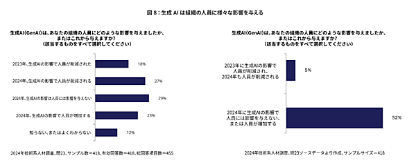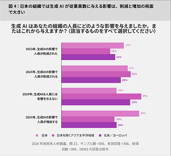 ところが、先ごろ公開された「2024年日本の技術系人材の現状レポート」によると、若干様相が異なります。下図にあるように、日本では、むしろ人員が「増加する」とした回答が「削減する」を上回っています。これは、既存の労働力を補完するものとして生成AIを活用するということだけでなく、AIの能力を導入することで新規採用労働力の効果を増幅させるという日本企業の独特な戦略的アプローチを反映しているように思います。