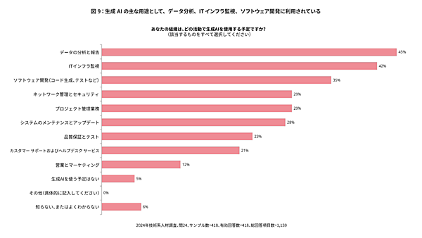 では、具体的にどのような領域でこの生成AIを活用しているのでしょうか。下図にあるように、大半の組織がデータ分析と報告(45%)、次いでITインフラ監視(42%)、ソフトウェア開発(35%)で使用していることが分かります。これらは自動化が積極的に推進されている領域であることから、当然の結果であると言えます。一方「カスタマーサポートおよびヘルプデスクサービス」が意外に活用されていないという結果になっていますが、この領域は既に自動化がかなり進んでいることに要因があるかも知れません。