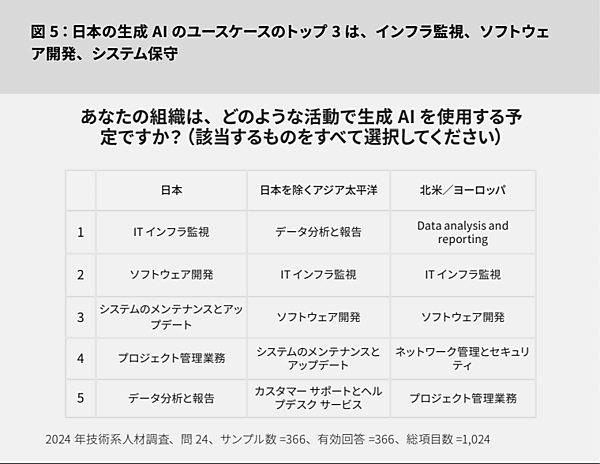 ここでも日本の生成AIのユースケースのトップ3は「インフラ監視」「ソフトウェア開発」「システム保守」の順になっており、日本は他の地域と少し異なっているようです。