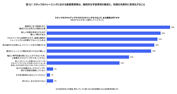 スキルアップやクロススキリングを実施するための課題が下図にまとめられています。最も重要なことは、継続的な学習のための環境を作り醸成すること(39%)で、新しい知識を実践的な応用に効果的に結びつけることの難しさ(35%)も、もう1つの大きな課題です。