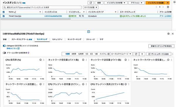 - EC2のインスタンスが起動したら、インスタンス一覧から該当のインスタンスを選択し、ウィンドウ下部に表示されている「モニタリング」タブをクリックしてください。CPU使用率、ネットワーク送受信量、CPUクレジット残高といった、ごくごく基本的な情報であれば、これだけで監視ができていることが分かります。