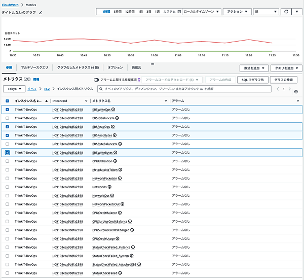 - 「インスタンス別メトリクス」を開くと、EC2インスンタンスのメトリクスがインスタンス別にリストアップされます。ここから表示させたいメトリクスにチェックを入れると、1つのグラフとして表示できます。