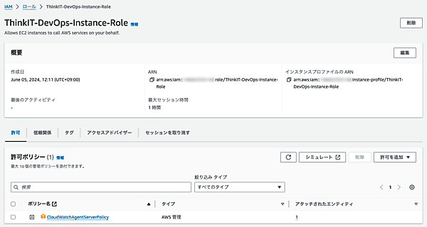 - まず、前準備としてCloudWatchへ情報を書き込める権限をEC2インスタンスに付与します。AWSのドキュメントを参考にして「CloudWatchAgentServerPolicy」ポリシーがアタッチされたロールを作成してください。