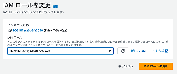- EC2インスタンスの一覧でインスタンスを選択して「アクション」→「セキュリティ」→「IAMロールを変更」をクリックします。アタッチするIAMロールを選択するページに遷移しますので、先ほど作成したロールを選択してください。
