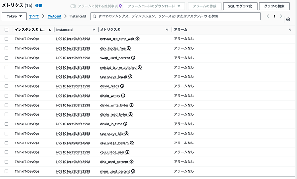 $ sudo /opt/aws/amazon-cloudwatch-agent/bin/amazon-cloudwatch-agent-ctl -a fetch-config -m ec2 -c file:/opt/aws/amazon-cloudwatch-agent/bin/config.json $ sudo systemctl enable --now amazon-cloudwatch-agent.service - しばらく待つと、CloudWatchのメトリクスに「CWAgent」というカスタム名前空間が表示されます。CloudWatchエージェントが収集したメトリクスは、その中に集められています。