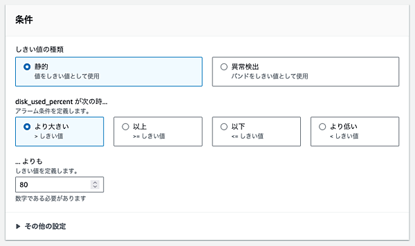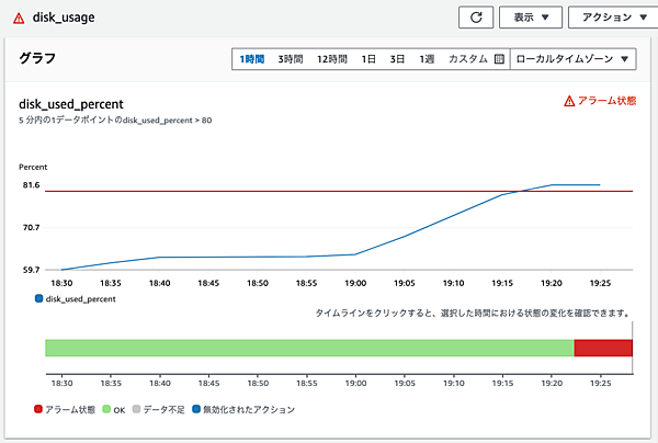 - これでディスク使用量が80%を越えたときにアラームが発生します。