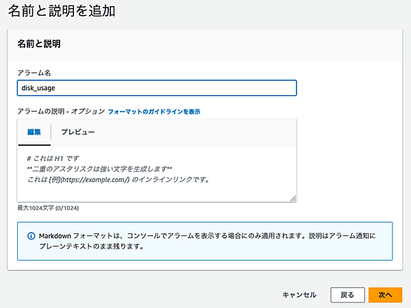 メトリクスは見られるようになりましたが、それだけでは不十分です。異常が発生したときに気づけるよう、監視したい項目にはアラームを設定しましょう。ここでは例として、データベースサーバーなどでありがちな、サーバーのストレージが枯渇したときのアラームを設定してみます。
