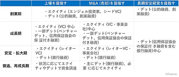 IPO(Initial Public Offering:上場)を目指す場合とM&Aによる売却を目指す場合の資金調達戦略は、エクイティファイナンスとデットファイナンスを選択するタイミングは似ている一方、資金調達先に求める資金調達以外の要素に違いがあります。