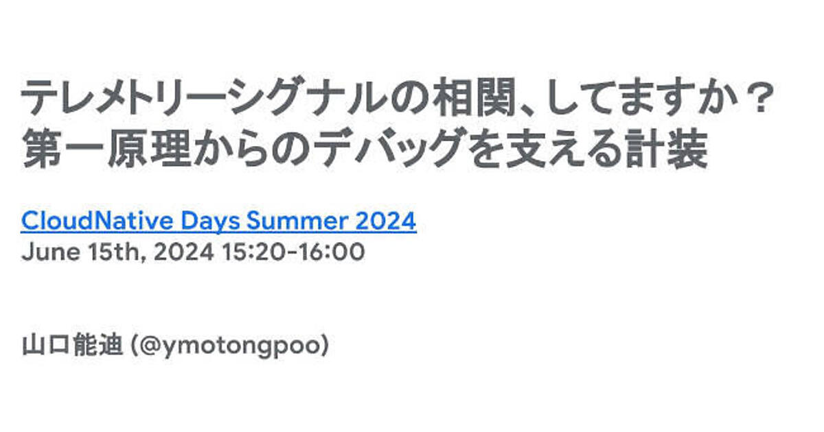 CloudNative Days Summer 2024では、グーグル・クラウド・ジャパン合同会社の山口 能迪氏が「テレメトリーシグナルの相関、してますか? 第一原理からのデバッグを支える計装」と題してセッションを行った。第一原理に基づくデバッグの重要性と、それを支えるテレメトリーシグナルの相関について詳細に解説した。セッションは、理論と実践の両面からオブザーバビリティを支える計装技術の全体像を明らかにする内容となった。