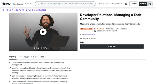 オンライン学習サイト「Udemy」にもDevRelに関するコースがあります。