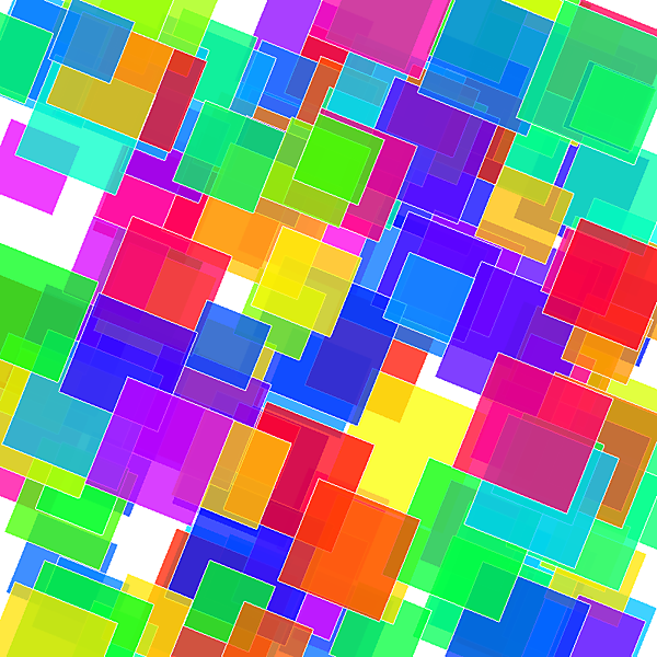 今度は、色が変化するだけのサンプルスクリプト「animation.py」を改造して150個の正方形のデータをランダムに用意し、1コマずつ1枚ずつの正方形を追加しながらその場で回転させます。
