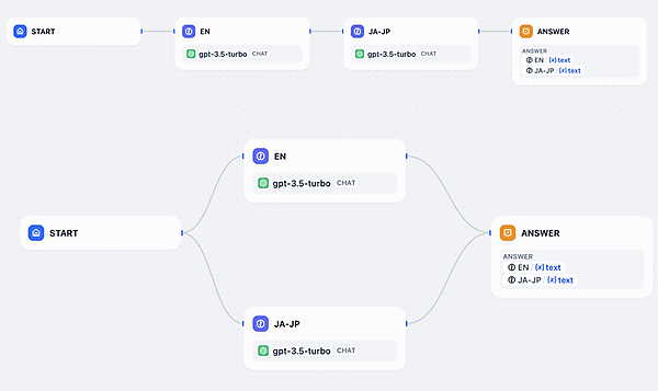 さらに、Difyは2024年9月10日のアップデートで並列処理が可能になり、これまで逐次実行していた処理の高速化を実現しました。直列処理と並列処理のワークフロー例としては下図のようなものがあり、順次実行するしかなかった翻訳パートを同時に実行することが可能になります。これにより複数の言語への同時翻訳が可能となり、全体の処理時間が大幅に短縮されます。