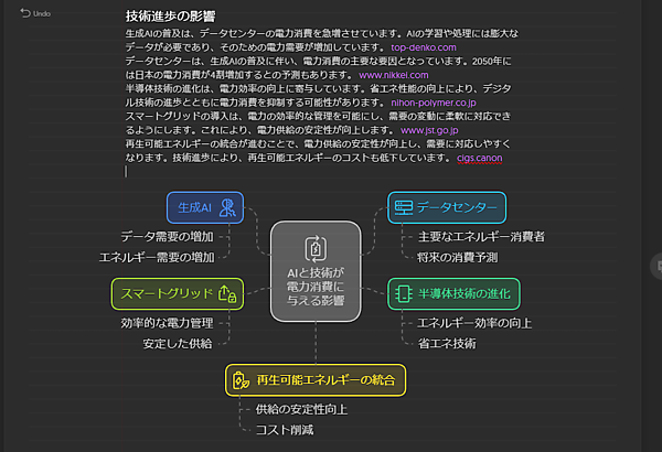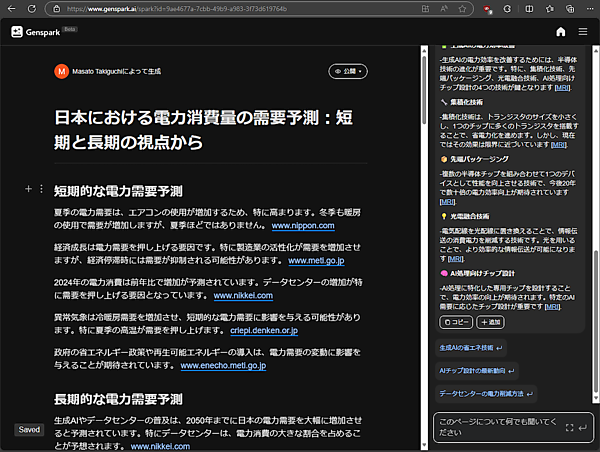 - まずはGensparkで調査を実施します。テーマには「日本における電力消費量の需要予測を短期と長期の観点で調査しまとめてください。」と入力します。GensparkのSparkPageを使えば調査内容をノートにまとめる感覚で調査ができます。実際のSparkPageはこちらです。