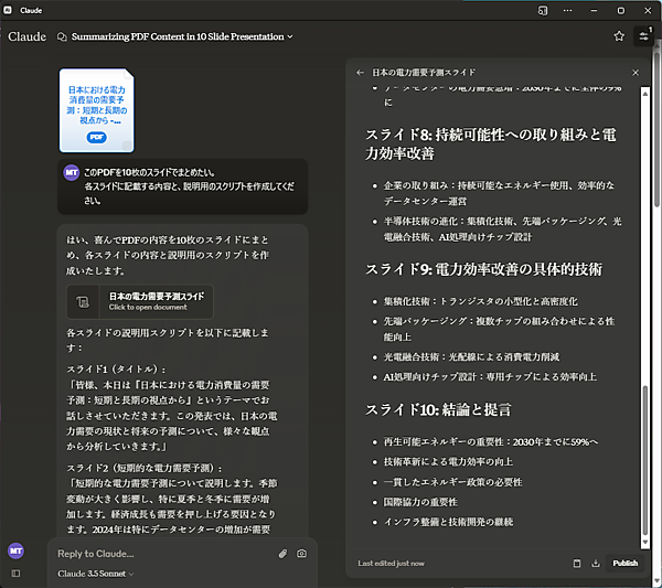 - 調査が終わったら次はスライド化を行いますが、その前に調査結果を簡潔にまとめたいと思います。Claudeを使って調査結果を整形してみましょう。GensparkのSparkPageをPDFで出力し、それをClaudeにアップロードします。