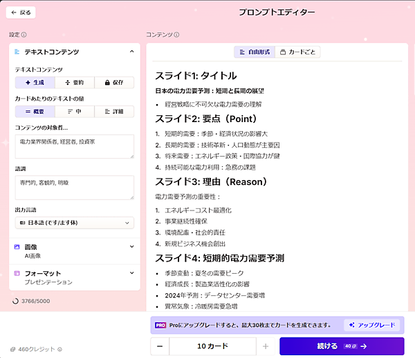 スクリプトでは「思います。」ではなく、「~と考えます」「~と考察できます」を使用する。 - 続いて、GammaにClaudeで作成したスライド案を貼り付けます。新規作成で「テキストを貼り付ける」を選び、出力結果を貼り付けます。今回はスライドが10枚なので、10カードに変更しています。