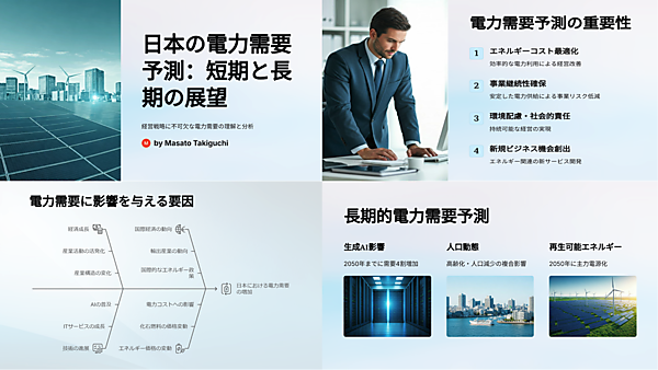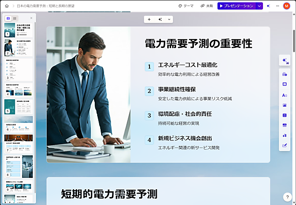 これでスライドが完成です! もちろんこれはそのまま使えるわけではありませんが、これをたたき台として使えば、これまで何時間もかかっていた調査とプレゼン資料の作成がはるかに短時間で完了することを実感できるのではないでしょうか。