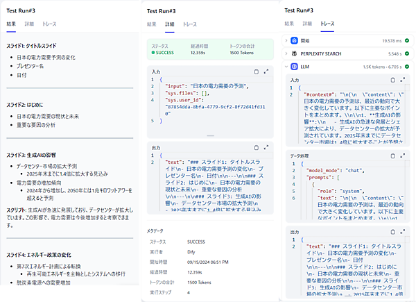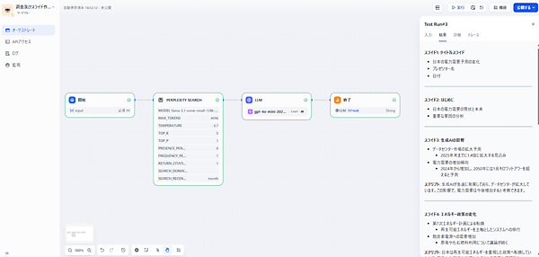 ユーザーは調査したい内容を入れるだけで、プレゼン資料のたたき台となる文章が出力されます。もうプロンプトを毎回入力する必要はありません(Difyの対応しているサービスの関係で今回はPerplexity+OpenAIのgpt-4o-miniを使用しています)。