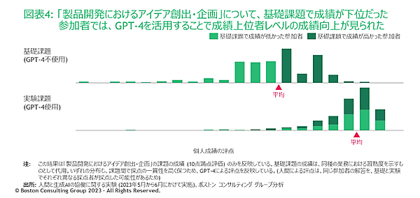 下図で製品開発におけるアイデア創出・企画の課題に対して、GPT-4不使用の場合と使用の場合における成績分布を表しています。BCGによれば「分布全体が右(より高い成績)へシフトし、製品開発におけるアイデア創出・企画の課題にGPT-4を使用した場合、基本的習熟度に関係なく、ほぼすべての参加者(約90%)がより質の高い解答を出す」ことが分かったそうです。そして「成績のばらつきが劇的に減少した」と報告しています。