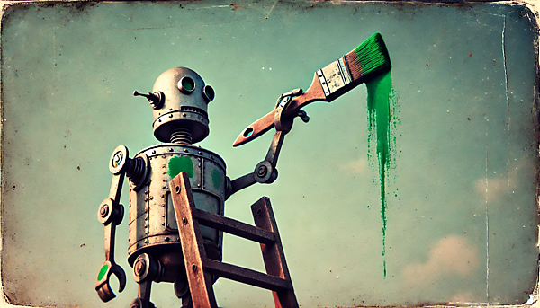 スクリプト: Create a picture of a robot trying to paint the sky green with a brush. The picture is a bit old-fashioned and sad.