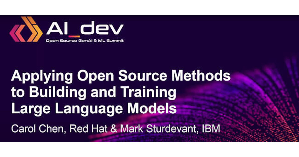 セッションのタイトルは「Applying Open Source Methods to Building and Training Large Language Models」、オープンソースによるソフトウェア開発の仕組みを大規模言語モデルに適用するInstructLabの背景と効果を解説する内容となっている。