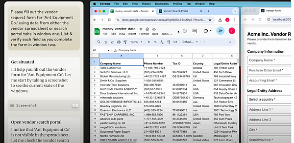 「Ant Equipment Co.」のためのベンダー申請書を、ウィンドウ1のベンダースプレッドシートまたは検索ポータルタブのいずれかのデータを使用して記入してください。ウィンドウ2のフォームを完成させる際に、各フィールドをリストアップし、確認してください。