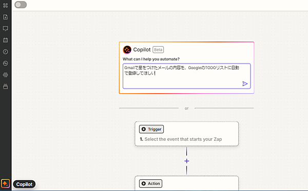 「+Create」→「Zaps」を選択し、作成画面へ進みます。 画面上部のCopilotに、実現したい内容を入力すると… ワークフローを提案してくれます(下図赤枠)。「Add all steps to Zap」を選択すると、ワークフローへ反映されます。 - GmailやGoogle Tasksの設定を進める