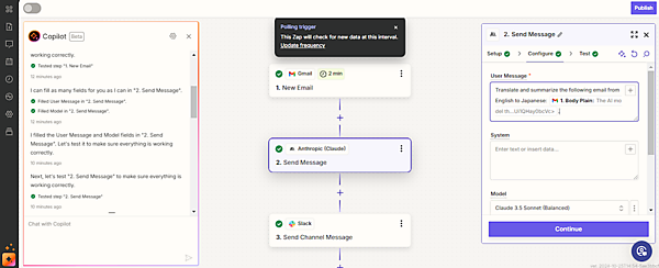 Gmailの設定:今回は「Newsletter」ラベルの付いたメールの受信をトリガーにしています。赤枠箇所でラベルを設定。 Claudeの設定:Claudeの連携には、事前にAPIキーの取得が必要です(APIキーがない場合も後述するAI by Zapierで実装可能)。 「User Message」欄の要約・翻訳指示もCopilotによる自動入力です。 Slackの設定: - 完成!