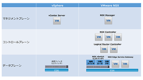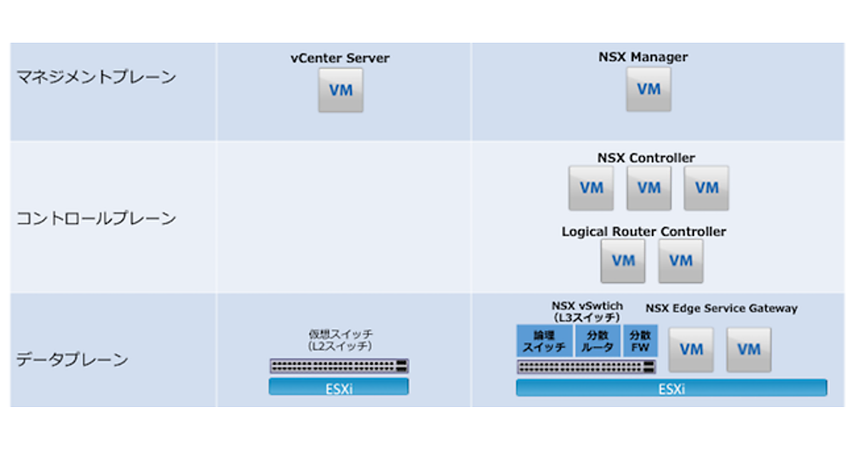 NSX vSwitchは通常vSphereで構成される分散仮想スイッチに対して、NSX環境の構成時にカーネルモジュールを追加することで、論理スイッチ(VXLAN)、分散ルータ、分散ファイアウォールの機能を追加したものです。カーネルモジュールを追加することで、L2スイッチだった分散仮想スイッチがVXLAN対応のL3スイッチとして動作するNSX vSwitchになると考えるとわかりやすいかもしれません。